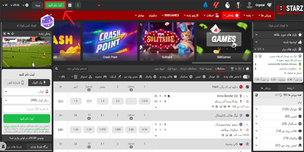 نحوه ورود به بخش ثبت نام در سایت 888استارز